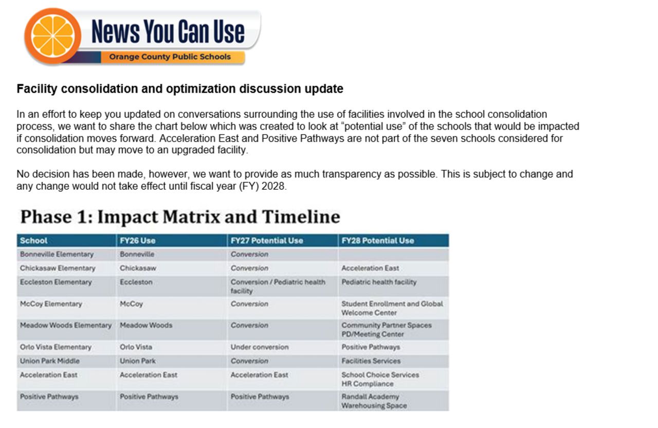 On Tuesday, OCPS sent out an email to its staff with a facility consolidation and optimization update showcasing all seven schools and their potential uses.