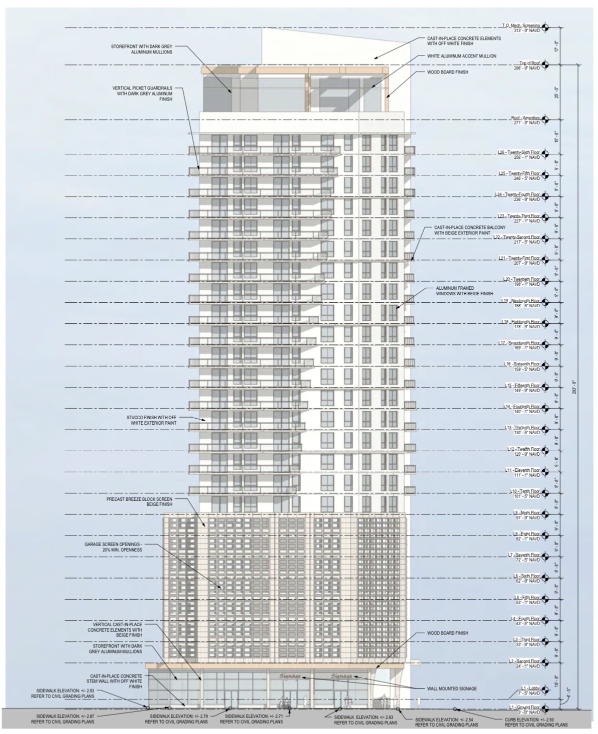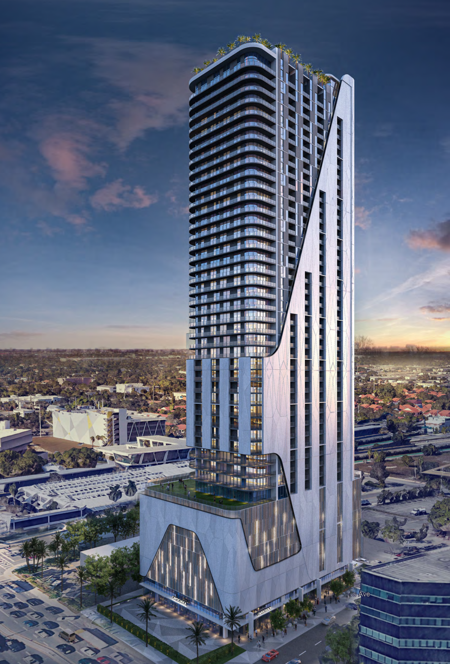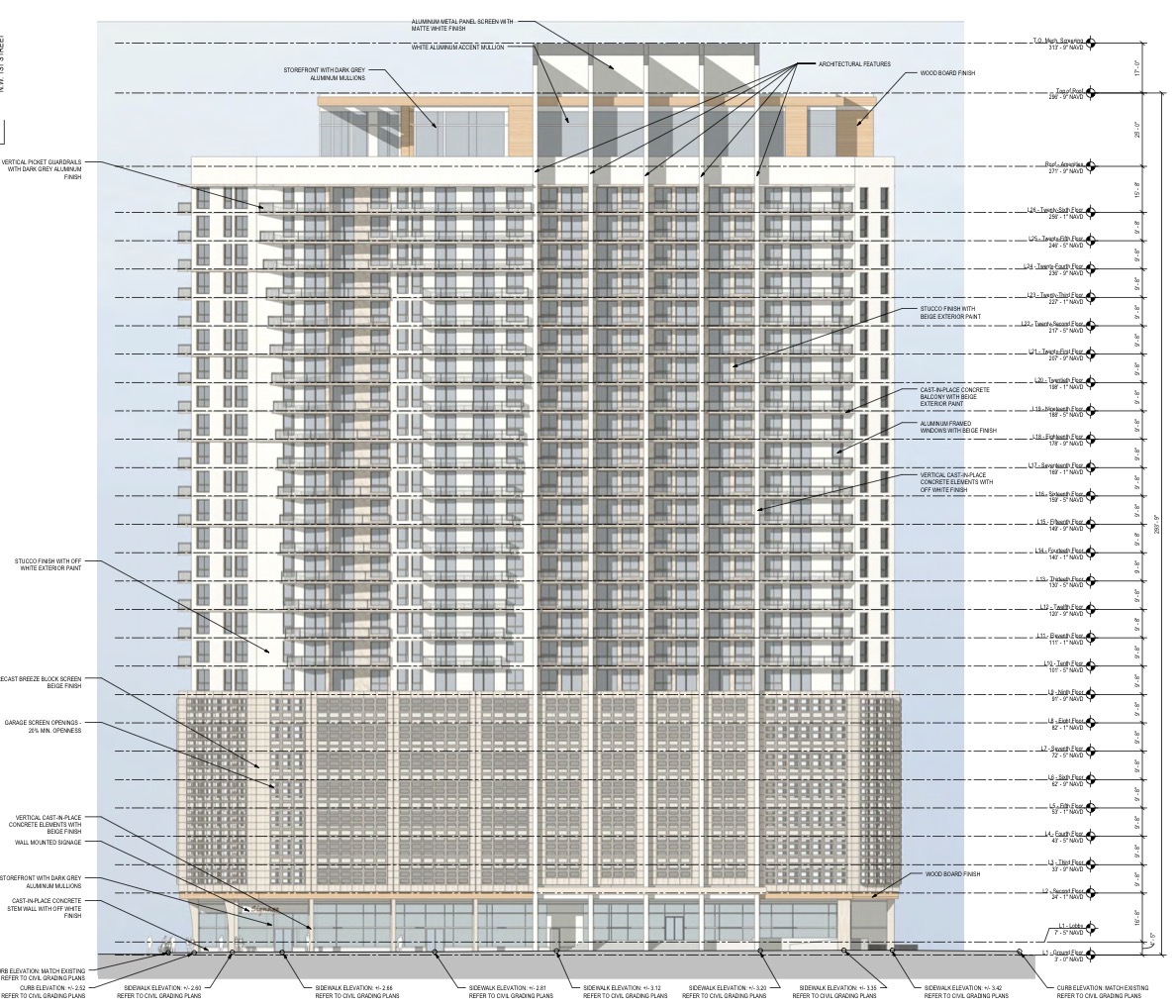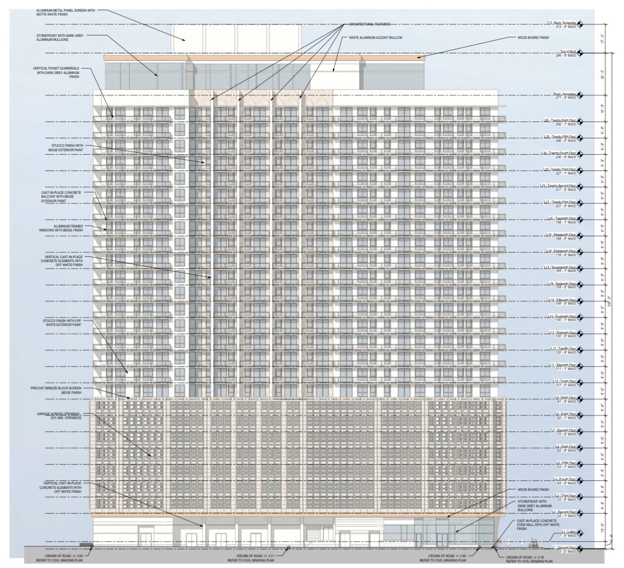 Levels 1 through 8 are dedicated to retail space, building amenities, and structured parking, while a resident amenity level is planned near the top of the tower, with mechanicals located above at the roof level. Parking is fully integrated within the building, with a total of 444 spaces provided.