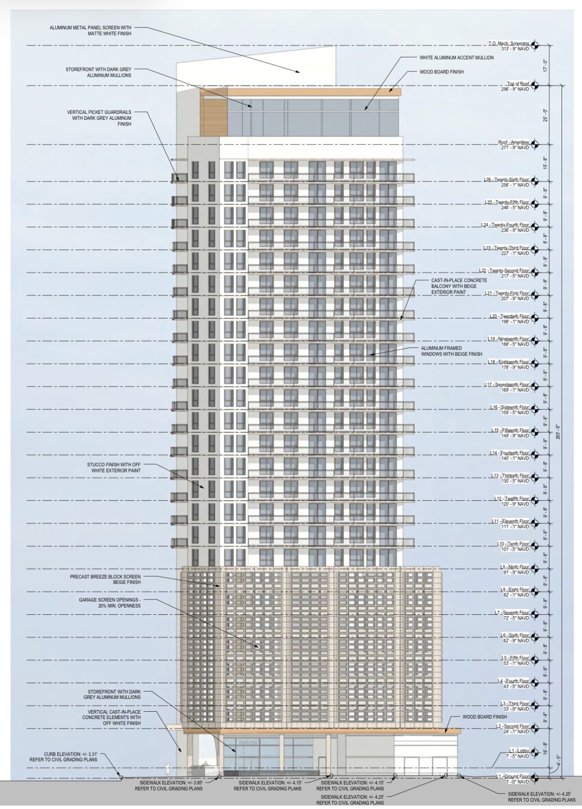 Revised plans have been filed for a mixed-use tower at 11 North Andrews Avenue in Downtown Fort Lauderdale. Designed by Cube3 and developed by Bachow Ventures in partnership with Infinity Collective, the proposal now calls for a 27-story building rising approximately 294 feet at the northwest corner of Broward Boulevard and North Andrews Avenue. The building would yield 560,217 gross square feet and include 378 multifamily residential units and approximately 5,605 square feet of ground-floor commercial space, with 382,595 square feet dedicated to residential uses and 172,017 square feet allocated to the structured parking garage.