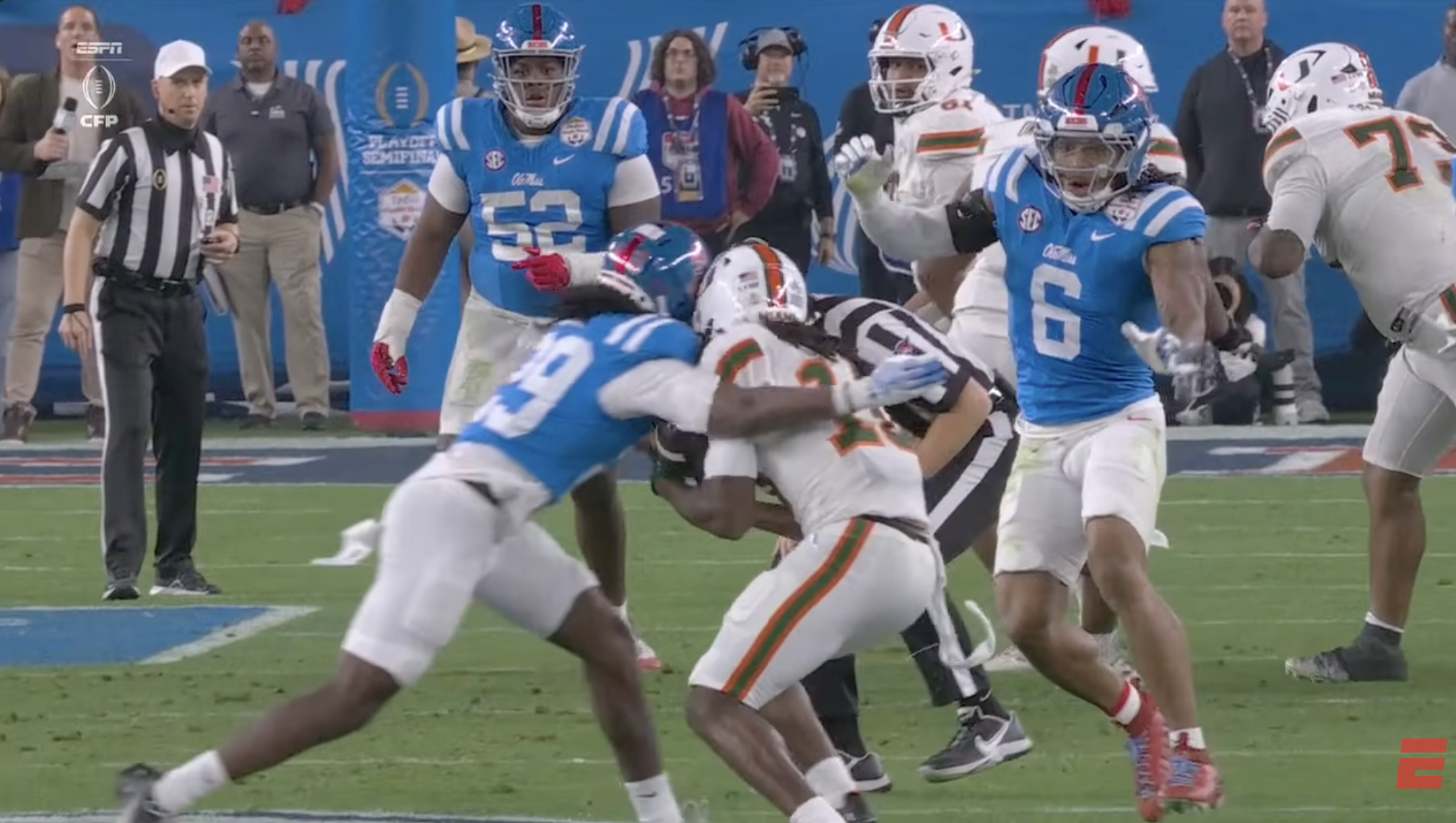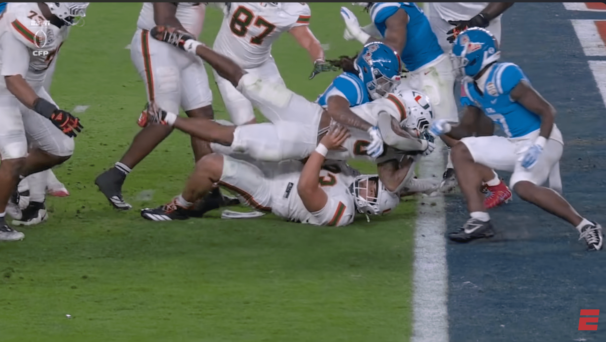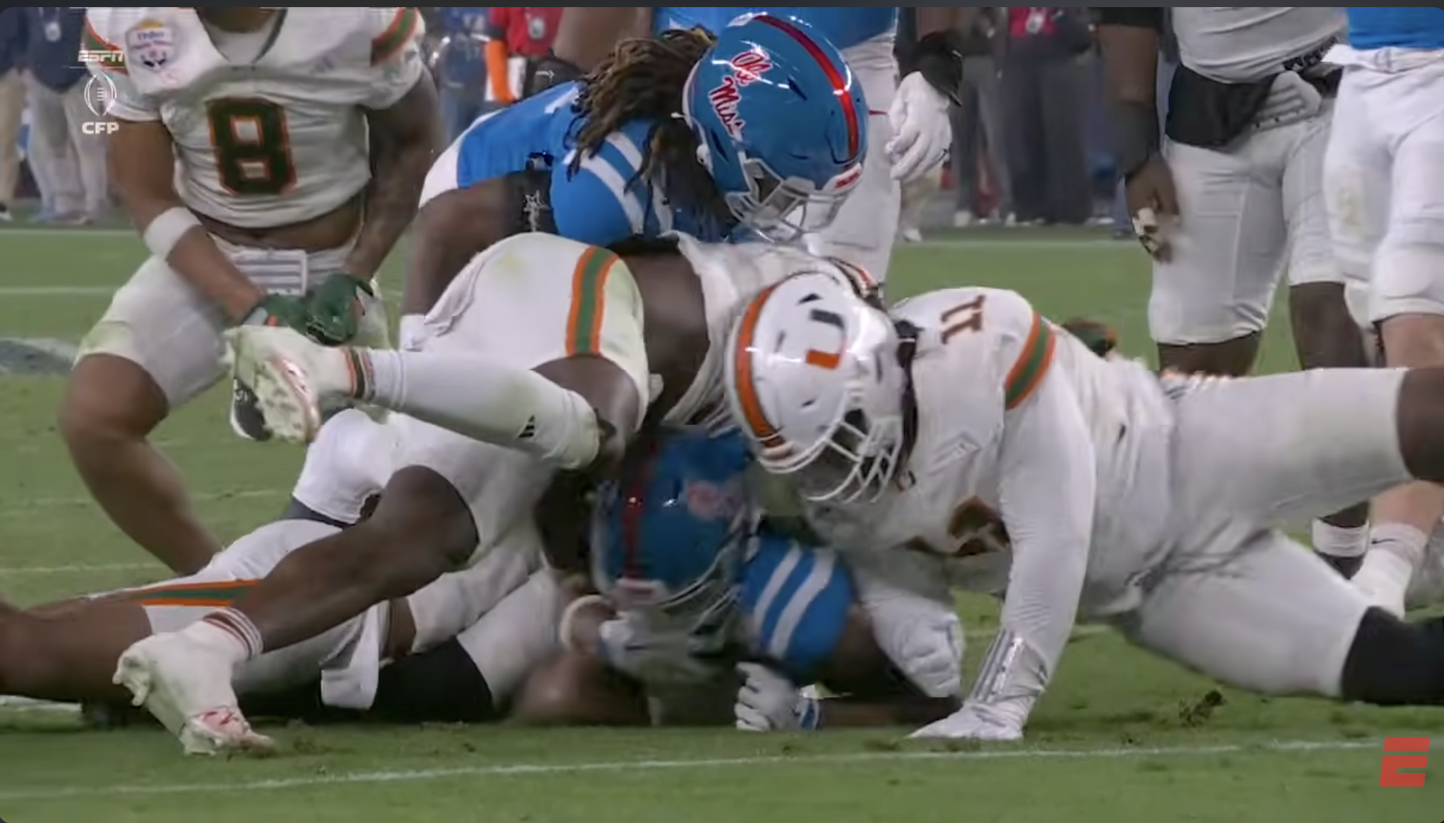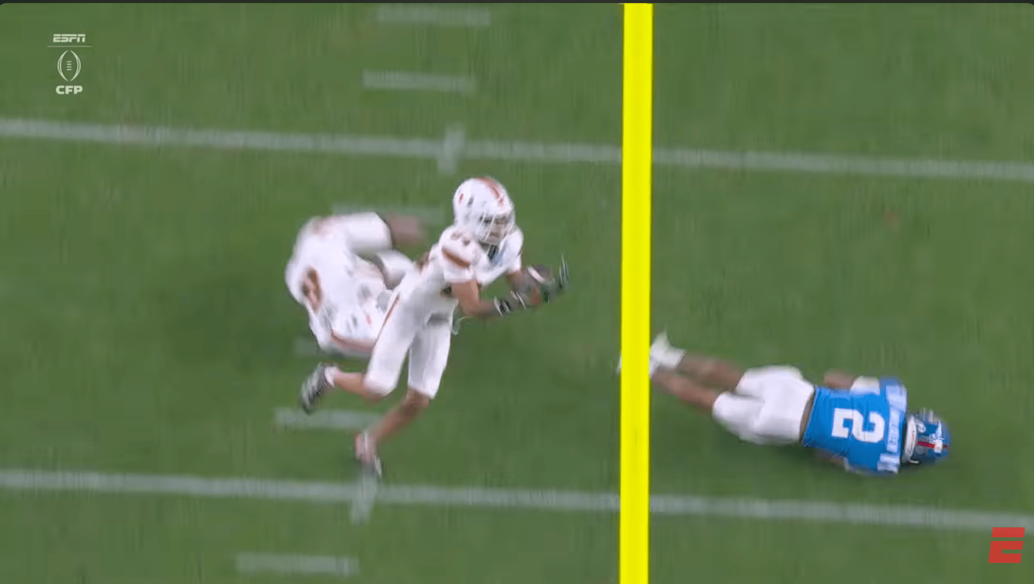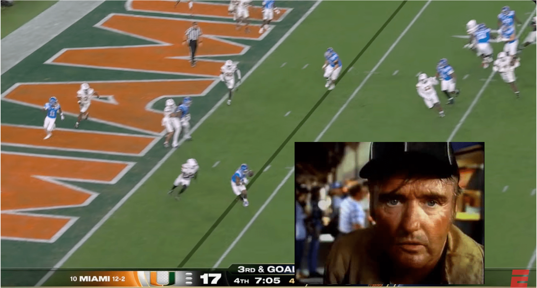 Above- One thing you can’t deny is the effort. Miami might’ve had stupid penalties and dropped INT’s, a targeting… but man they were trying. CJ Daniels effort here was championship caliber.