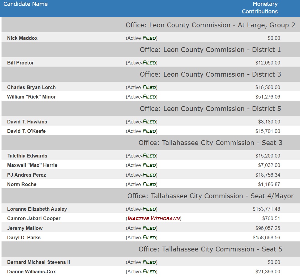 In Leon County Commission races, incumbents Nick Maddox and Bill Proctor have yet to draw an opponent. In the race for District 3, incumbent Rick Minor leads with $51,276. His challenger, Charles Lorch reported $16,500.