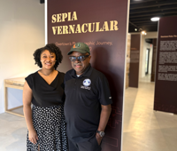 Pictured at the exhibition’s opening doors, SEOPW CRA Director of Operations Natalya Sangster and Executive Director James McQueen welcome visitors to Sepia Vernacular.