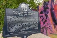 A plaque honoring Judge Lawson E. Thomas stands inside the building where he once practiced law.