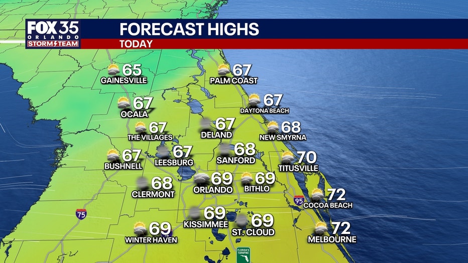 Temperatures today will be just shy of what’s considered average for this time of year. Plan for highs to reach the middle to upper 60s, with a high of 69° today in Orlando.