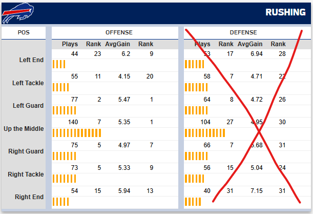 I crossed out the defense since we’re focusing on the offense here, but it’s legible still if you’re curious. On offense, while the Bills were the second-highest yards-per-play rushing the ball this season, that’s not true in all areas of the field.