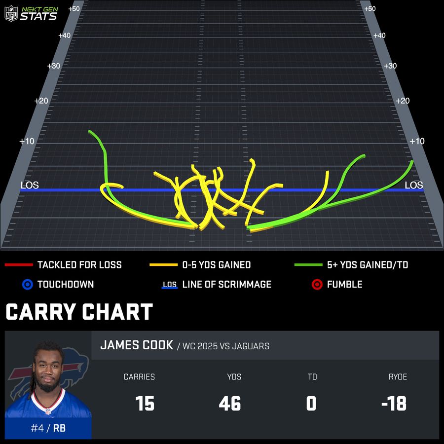Further, Cook carried the ball in all directions twice as often in the first half compared to the second (10 rushes compared to five). The Bills, a run-first team that has dominated in the middle of the formation, mostly abandoned these things against a Jaguars team that was well prepared for it.