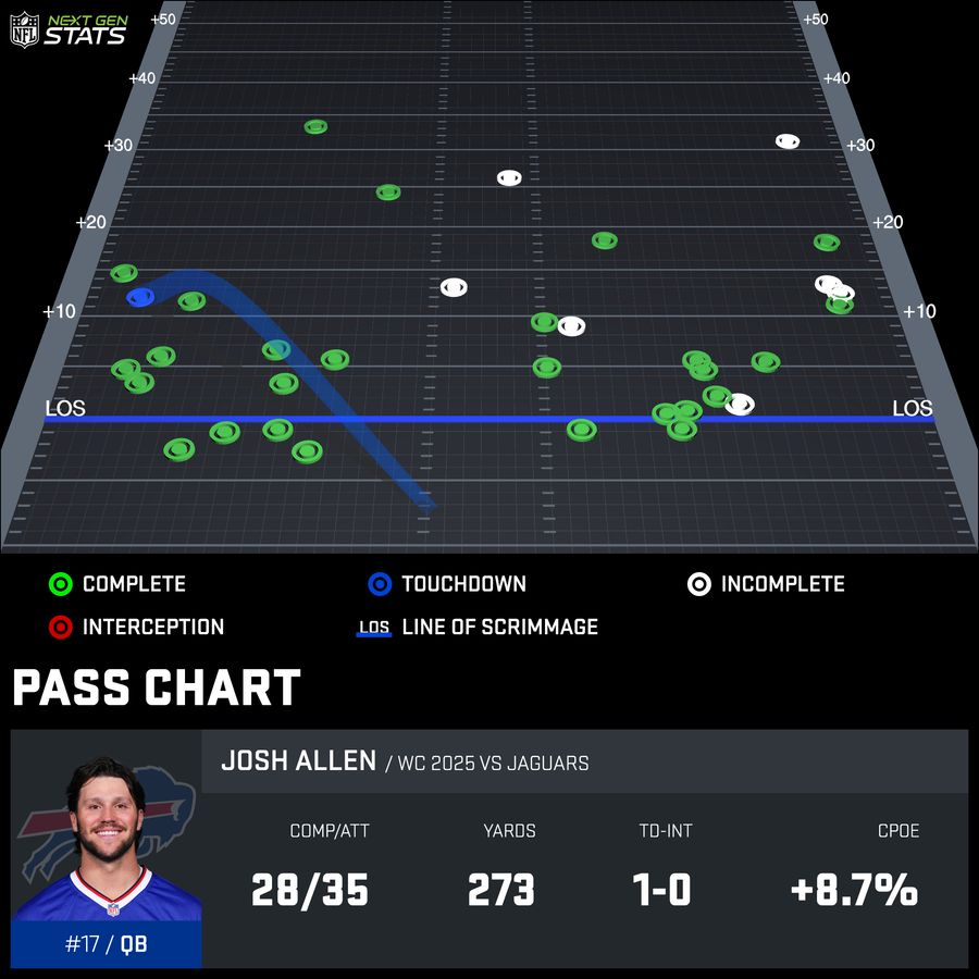 That information makes it fun to discover that quarterback Josh Allen threw 13 passes to the left/short section of the field by my count, and he had a 100% completion percentage. Compare that to eight passes to the right as I count it, with a still-excellent 88% completion percentage. The big tendency breaker here is leaning so much more on the left side of the field.
