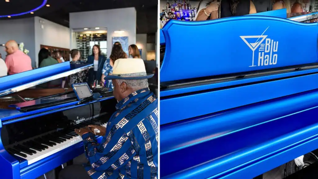 The restaurant’s iconic baby grand piano; images via The Blu Halo