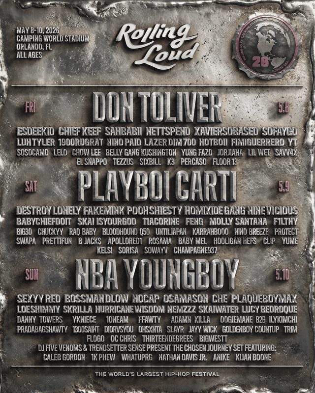 Carti returns to Rolling Loud following a widely discussed 2.5-hour headlining set at Rolling Loud California 2025, which came days after the release of his album I Am Music. It’ll be the first time YoungBoy Never Broke Again headlines a Rolling Loud festival, just ahead of the release of his upcoming album, Slime Cry.