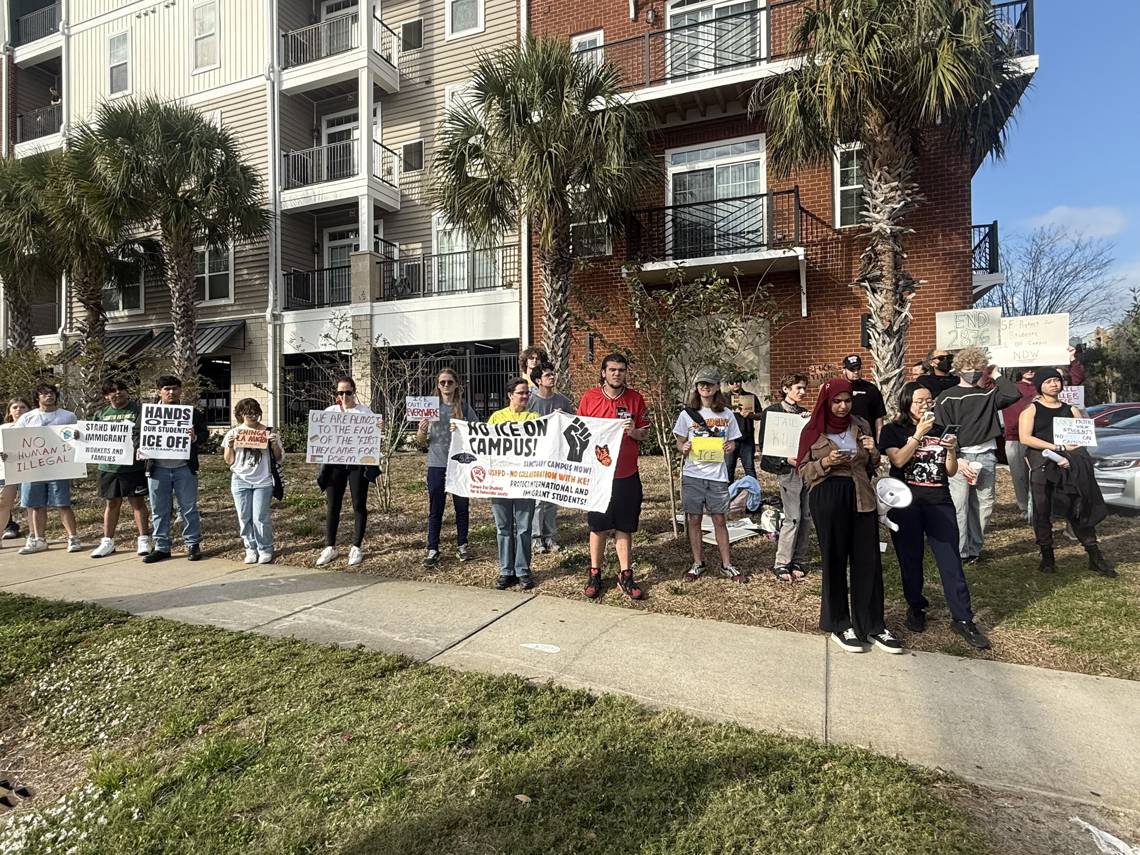 55 demonstrators gathered along Fletcher Avenue across from USF Palm Drive, protesting the University of South Florida (USF) for advertising U.S. Customs and Border Protection (CBP) recruitment and collaborating with Immigration and Customs Enforcement (ICE).
