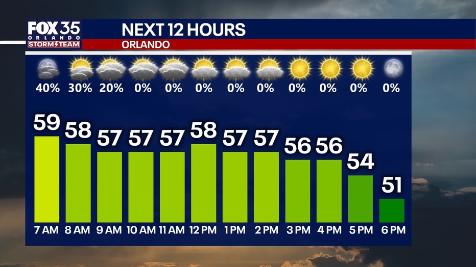 Temperatures won’t budge very much today, as highs struggle to reach even the low 60s. Most spots will see afternoon highs peak around the mid to upper 50s. For perspective, our average high in Orlando is 71°. Once the rain ends, clouds will stick around a bit before eventually giving way to some sunshine just ahead of sunset.