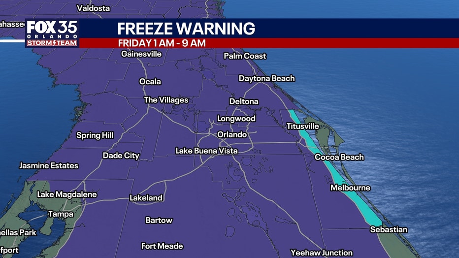 A Freeze Warning is in place for nearly all of Central Florida from 1 a.m – 9 a.m. This accounts for temperatures that will fall at or below freezing for many areas, especially northwest of I-4. This is where temperatures will likely fall into the 20s for morning lows. While winds won’t be quite as gusty overnight and into tomorrow morning, peak gusts will still see peak speeds of around 15-20 mph. This brisk northerly breeze will cause wind chills to fall into the 20s as well.
