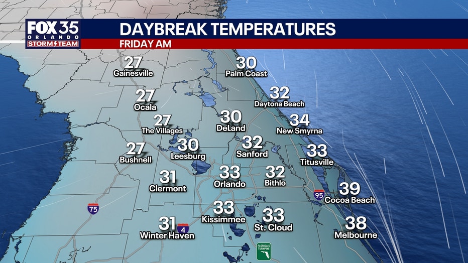 We’re gearing up for some of the coldest air we’ve felt in just over three years tomorrow morning. Temperatures will be their coldest between 3 a.m.-8 a.m., falling into the mid to upper 20s northwest of I-4, to around 30-32° in Orange, Seminole, and western Volusia counties, and closer to the mid 30s in Brevard and southern Volusia counties.