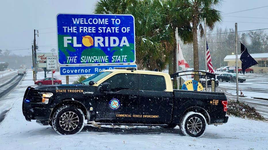 The Florida Highway Patrol posted a photo of one of its vehicles next to the state line in Pensacola with snow on the ground on Tuesday.