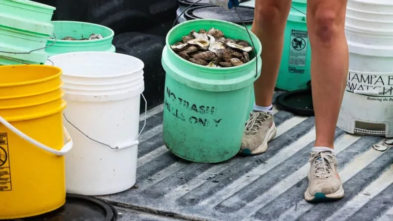 The process is simple. After guests snack on oysters during happy hours, servers take away the platters and deposit the shells into a pale green utility bucket marked “Tampa Bay Watch,” instead of tossing them into the trash.