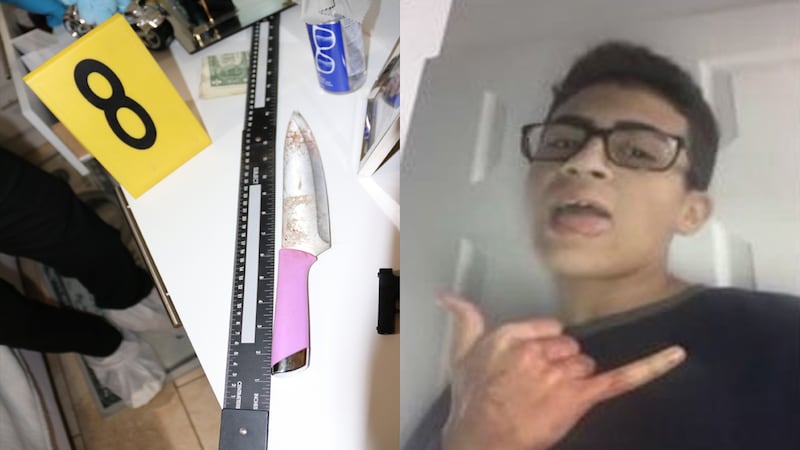 Derek Rosa and knife prosecutors say was used in his mother’s killing. (Miami-Dade State Attorney’s Office)