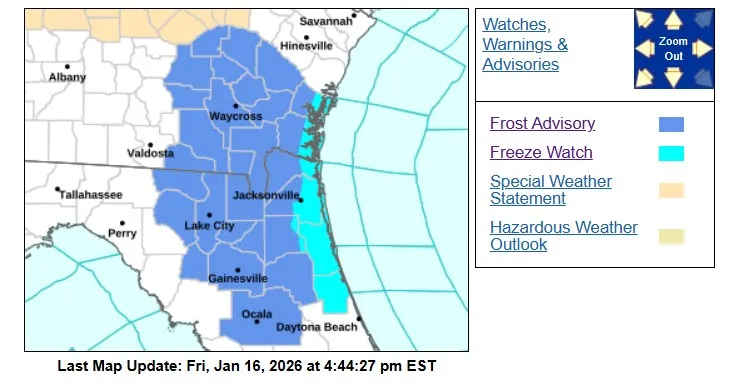 According to the National Weather Service (NWS), the frost advisory is going into place for cities including Lake City, Gainesville and Ocala from 11 p.m. to 8 a.m. Saturday. A freeze watch is also going into effect for coastal areas, including Jacksonville, St. Augustine, and Ponte Vedra Beach.