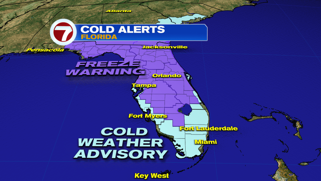 Cold Arctic air has spread into Florida and there are cold weather alerts in effect. Northern sections of the state waking up into the 20’s!