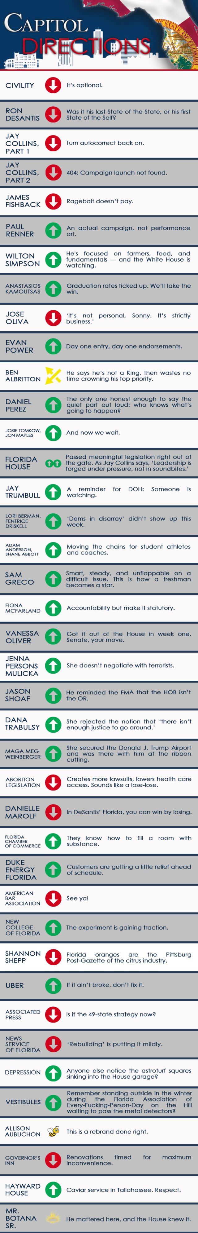 CIVILITY — Down arrow — It’s optional.RON DESANTIS — Down arrow — Was it his last State of the State, or his first State of the Self?JAY COLLINS, PART 1 — Down arrow — Turn autocorrect back on.JAY COLLINS, PART 2 — Down arrow — 404: Campaign launch not found.JAMES FISHBACK — Down arrow — Ragebait doesn’t pay.PAUL RENNER — Up arrow — An actual campaign, not performance art.WILTON SIMPSON — Up arrow — He’s focused on farmers, food, and fundamentals — and the White House is watching.ANASTASIOS KAMOUTSAS — Up arrow — Graduation rates ticked up. We’ll take the win.JOSÉ OLIVA — Down arrow — ‘It’s not personal, Sonny. It’s strictly business.’EVAN POWER — Up arrow — Day one entry, day one endorsements.BEN ALBRITTON — Crossways arrow — He says he’s not a King, then wastes no time crowning his top priority.DANIEL PEREZ — Up arrow — The only one honest enough to say the quiet part out loud: who knows what’s going to happen?JOSIE TOMKOW, JON MAPLES — Up arrow — And now we wait.FLORIDA HOUSE — Double up arrow — Passed meaningful legislation right out of the gate. As Jay Collins says, ‘Leadership is forged under pressure, not in soundbites.’JAY TRUMBULL — Up arrow — A reminder for DOH: Someone is watching.LORI BERMAN, FENTRICE DRISKELL — Up arrow — ‘Dems in disarray’ didn’t show up this week.ADAM ANDERSON, SHANE ABBOTT — Up arrow — Moving the chains for student athletes and coaches.SAM GRECO — Up arrow — Smart, steady, and unflappable on a difficult issue. This is how a freshman becomes a star.FIONA MCFARLAND — Up arrow — Accountability but make it statutory.VANESSA OLIVER — Up arrow — Got it out of the House in week one. Senate, your move.JENNA PERSONS MULICKA — Up arrow — She doesn’t negotiate with terrorists.JASON SHOAF — Up arrow — He reminded the FMA that the HOB isn’t the OR.DANA TRABULSY — Up arrow — She rejected the notion that ‘there isn’t enough justice to go around.’MAGA MEG WEINBERGER — Up arrow — She secured the Donald J. Trump Airport and was there with him at the ribbon cutting.ABORTION LEGISLATION — Down arrow — Creates more lawsuits, lowers health care access. Sounds like a lose-lose.DANIELLE MAROLF — Down arrow — In DeSantis’ Florida, you can win by losing.FLORIDA CHAMBER OF COMMERCE — Up arrow — They know how to fill a room with substance.DUKE ENERGY FLORIDA — Up arrow — Customers are getting a little relief ahead of schedule.AMERICAN BAR ASSOCIATION — Down arrow — See ya!NEW COLLEGE OF FLORIDA — Up arrow — The experiment is gaining traction.SHANNON SHEPP — Down arrow — Florida oranges are the Pittsburg Post-Gazette of the citrus industry.UBER — Up arrow — If it ain’t broke, don’t fix it.ASSOCIATED PRESS — Down arrow — Is it the 49-state strategy now?NEWS SERVICE OF FLORIDA — Down arrow — ‘Rebuilding’ is putting it mildly.DEPRESSION — Up arrow — Anyone else notice the astroturf squares sinking into the House garage?VESTIBULEs — Up arrow — Remember standing outside in the winter during the Florida Association of Every-Fucking-Person-Day on the Hill waiting to pass the metal detectors?ALLISON AUBUCHON — Bumblebee — This is a rebrand done right.GOVERNOR’S INN — Down arrow — Renovations timed for maximum inconvenience.HAYWARD HOUSE — Up arrow — Caviar service in Tallahassee. Respect.MR. BOTANA SR. — Halo — He mattered here, and the House knew it.
