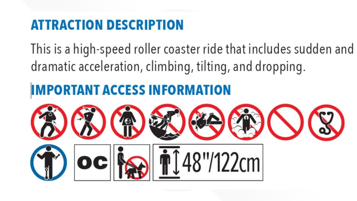 According to the theme park, a sign at the entrance of the ride features a number of warning symbols, including ones saying you should not ride if you have a history of heart conditions, abnormal blood pressure, back or neck conditions, weakened bones or muscles, or sensitivity to fog or strobing effects.