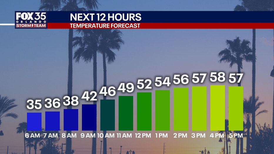 Temperatures will turn cold tonight, but it won’t be as chilly as this morning. Plan for lows to fall into the low to mid 30s northwest of I-4 and closer to the upper 40s and low 40s southeast of I-4 under clear skies.