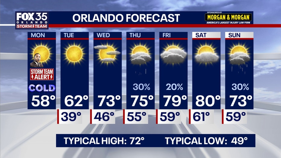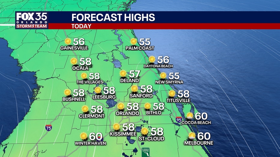 Orlando will see a high of 58°, the average high is 72°. Sunshine will be plentiful with clear skies underway.
