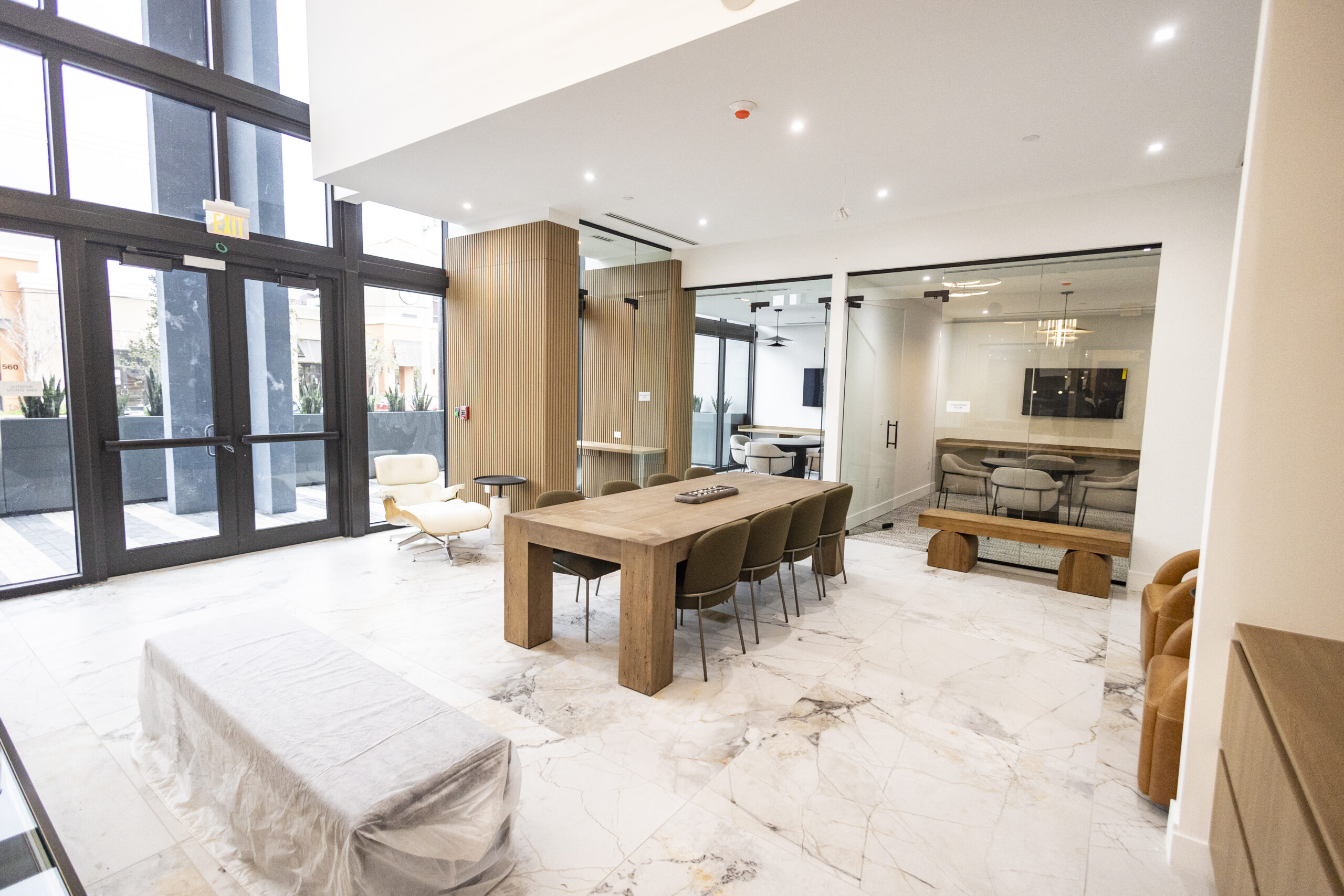 Residential interiors feature Energy Star-rated stainless steel appliances, stone-composition countertops, smart home systems, and designer finishes, with most units offering private balconies. The project was designed to meet Gold-level certification under the National Green Building Standard, utilizing soundproof construction methods, energy-efficient systems, and sustainable materials.