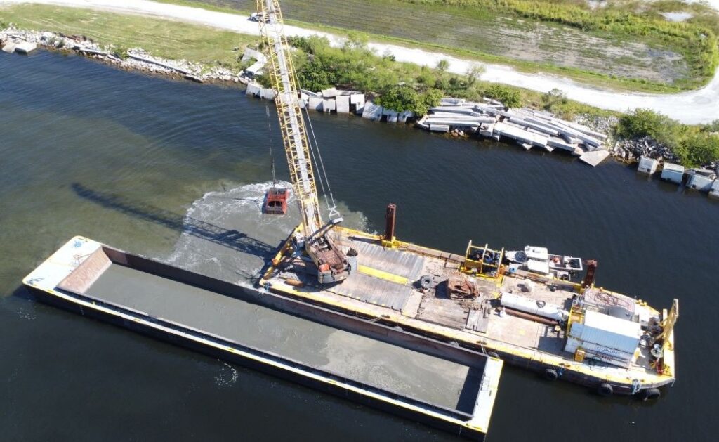 Also, the team handled material removal, barge transportation, and offloading to a remote placement facility, while managing environmental monitoring for turbidity, protected species, birds, and sea turtles.