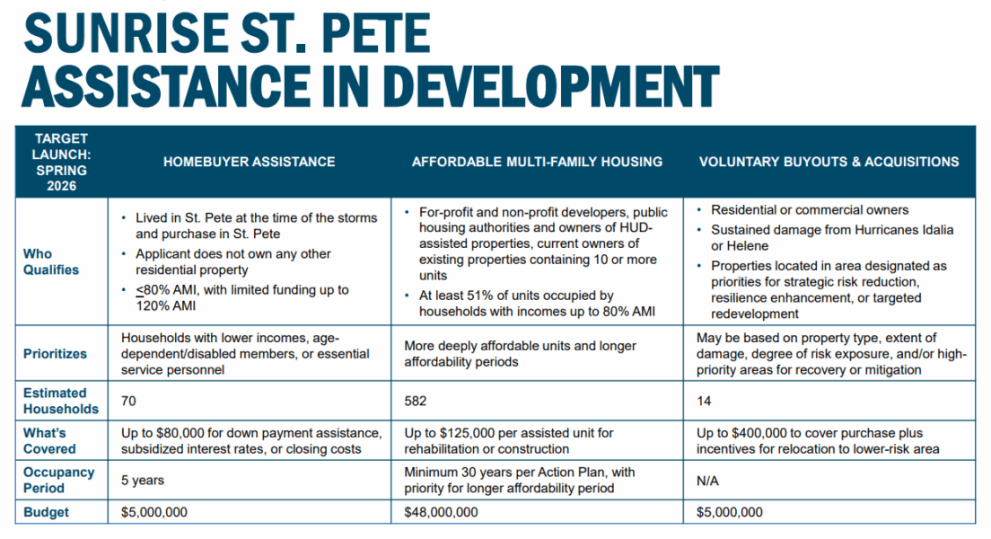 The federally funded Sunrise St. Pete initiative’s first phase will provide storm-affected homeowners with up to $375,000 for reconstruction, including elevation, $100,000 for rehabilitation and $50,000 for previously completed repairs. All eligible residents can also receive $15,000 for up to six consecutive months of rent, mortgage and utility payments.