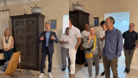 A group photo taken outside the event features Meiner and 2025 Commission candidates Fred Karlton and Minique Pardo Pope, both of whom lost their respective races. Many of the attendees wear hats that read, “Miami Beach Mayor Steven Meiner.”