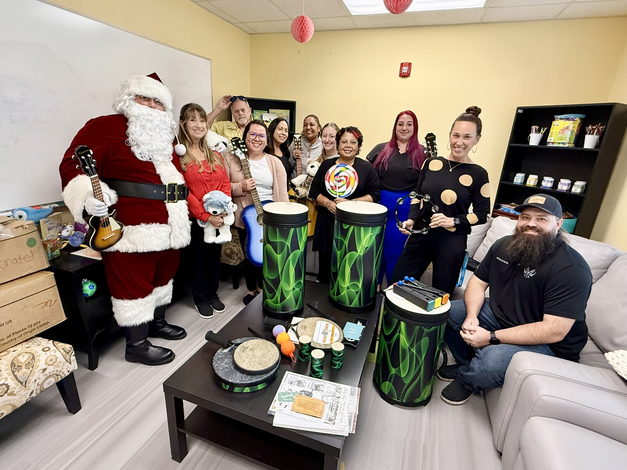 At the heart of this collaboration is the belief that music can reach deep into the human spirit, especially when words are hard to find. Music Has Healing Power, together with partners Savage 4×4, Remo Inc., and Gibson Gives, recently donated an array of musical instruments to the Children’s Advocacy Center including acoustic guitars, an acoustic-electric guitar, an acoustic-electric Les Paul ukulele, drums, and more. These instruments were delivered last month with the help of community partners and a very special visit from Santa Claus, creating a joyful and memorable moment for clients and staff alike.
