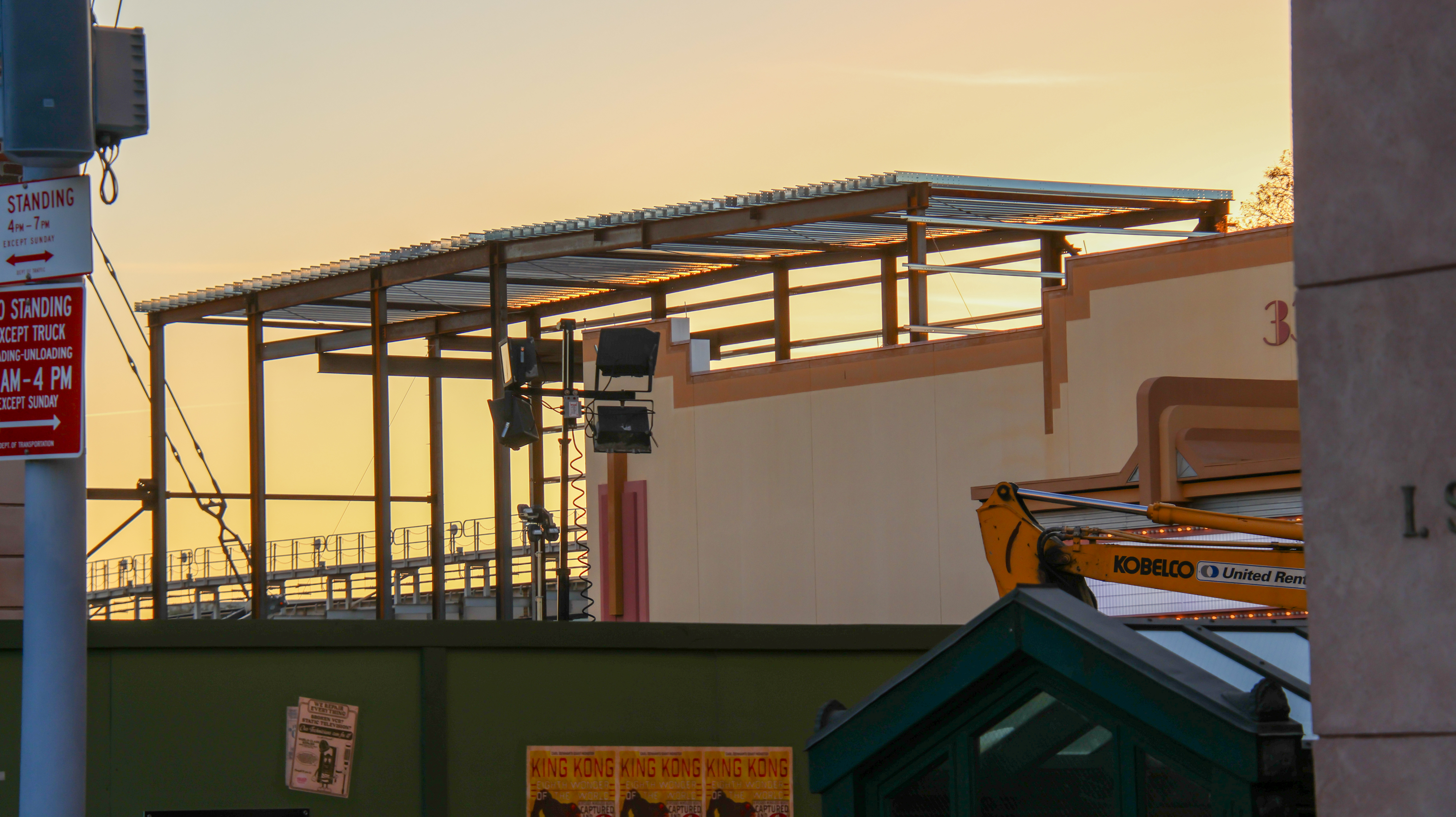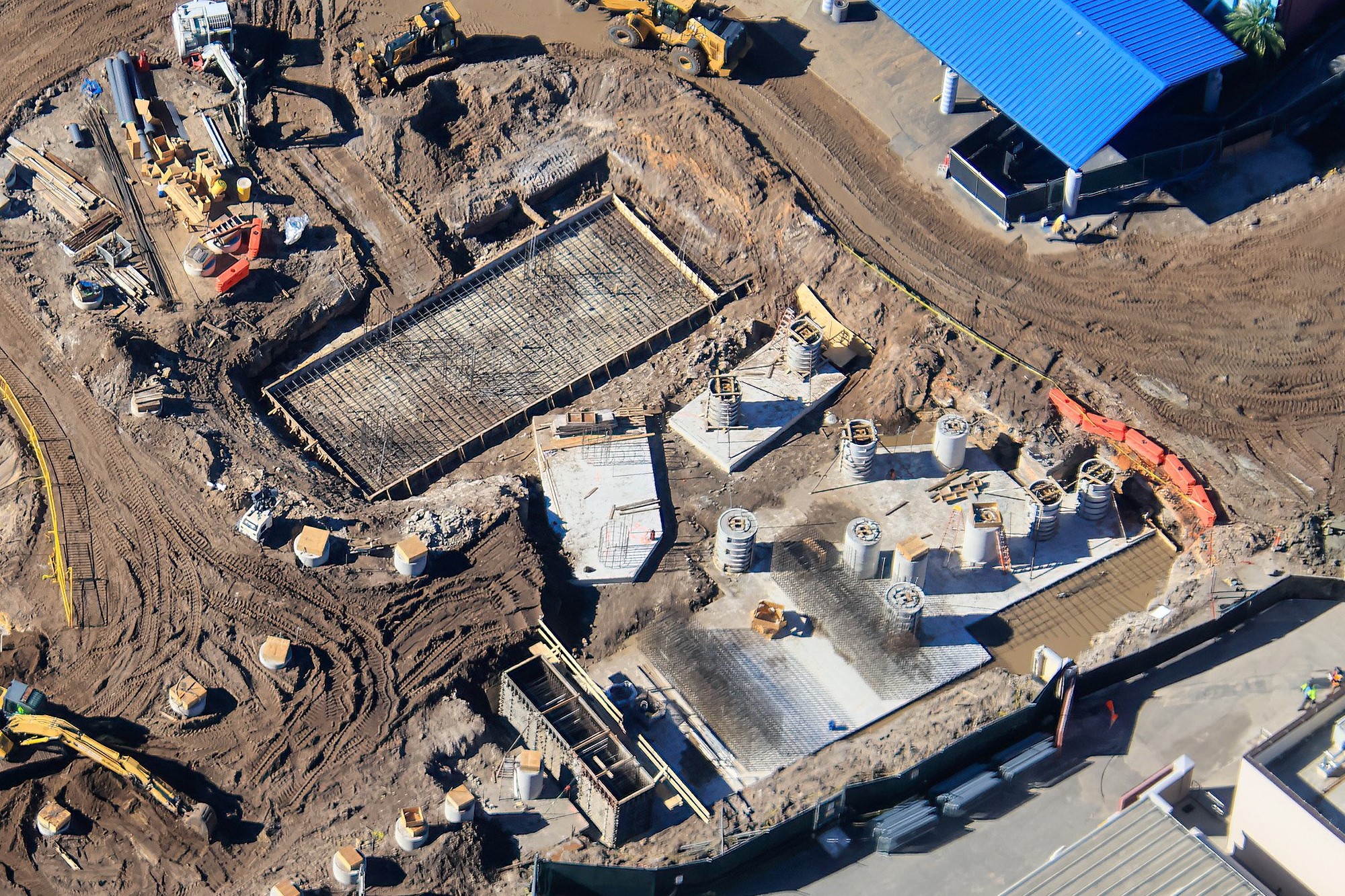 Located backstage behind the sound stages, this future structure already has footings inside for multiple coaster maintenance spurs.