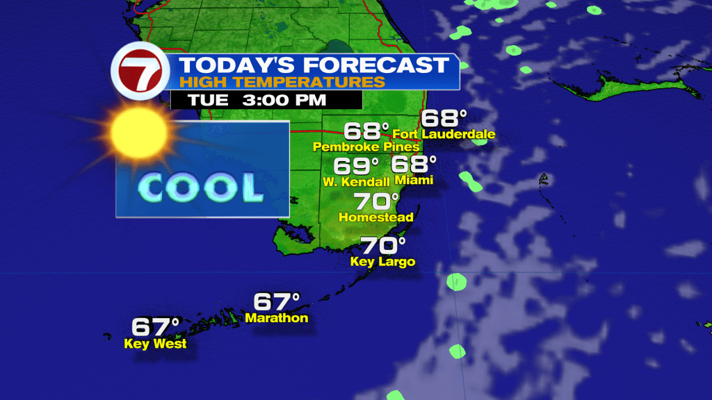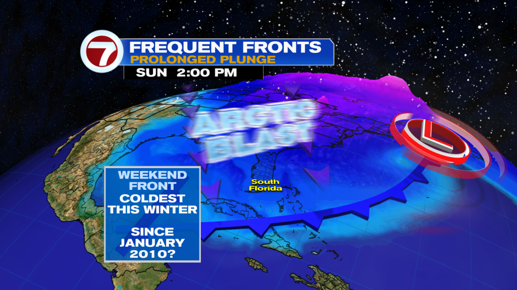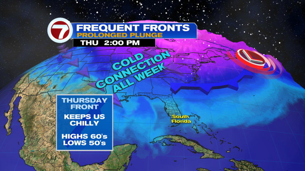 The chill will linger throughout the week as a parade of cold fronts sweep across Florida. The next front is a weak reinforcing front that will push across South Florida on Thursday.