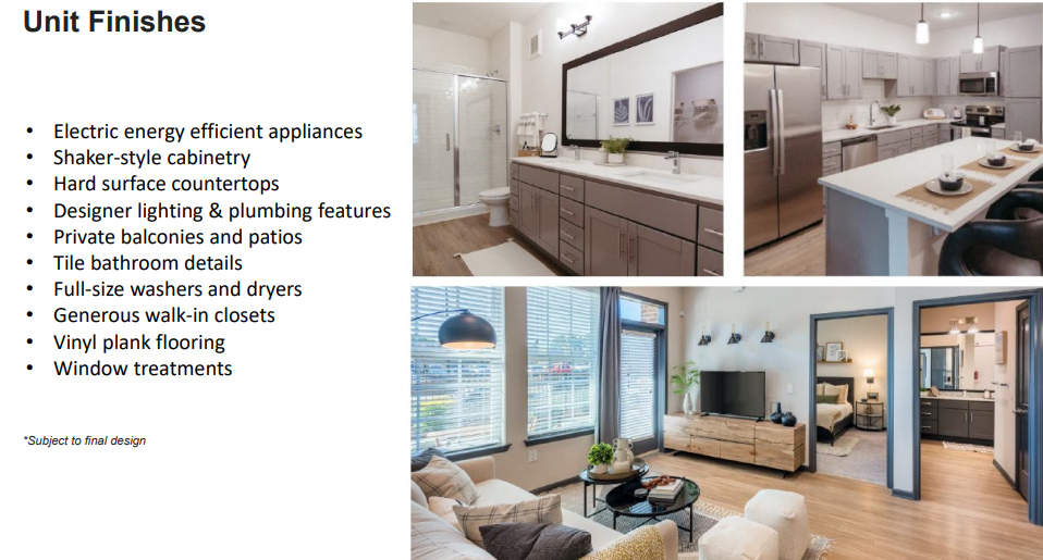 A wrapped parking garage will offer 271 vehicle and 218 bicycle parking spaces. Apartments average 1,022 square feet, and all will feature vinyl plank flooring, private balconies or patios, energy-efficient appliances and in-unit washers and dryers.