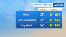 Now, Monday morning could also be in record territory for the date with a low forecast again of 36 degrees for both Miami and Fort Lauderdale. The current low record for Feb. 2 in Miami is 35 degrees set back in 1942. Fort Lauderdale’s current record for the date is 38 degrees set back 1979.