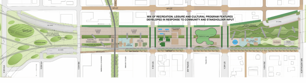 Possible features include children’s areas, a volleyball court, lawn amphitheater, pickleball courts and green space.