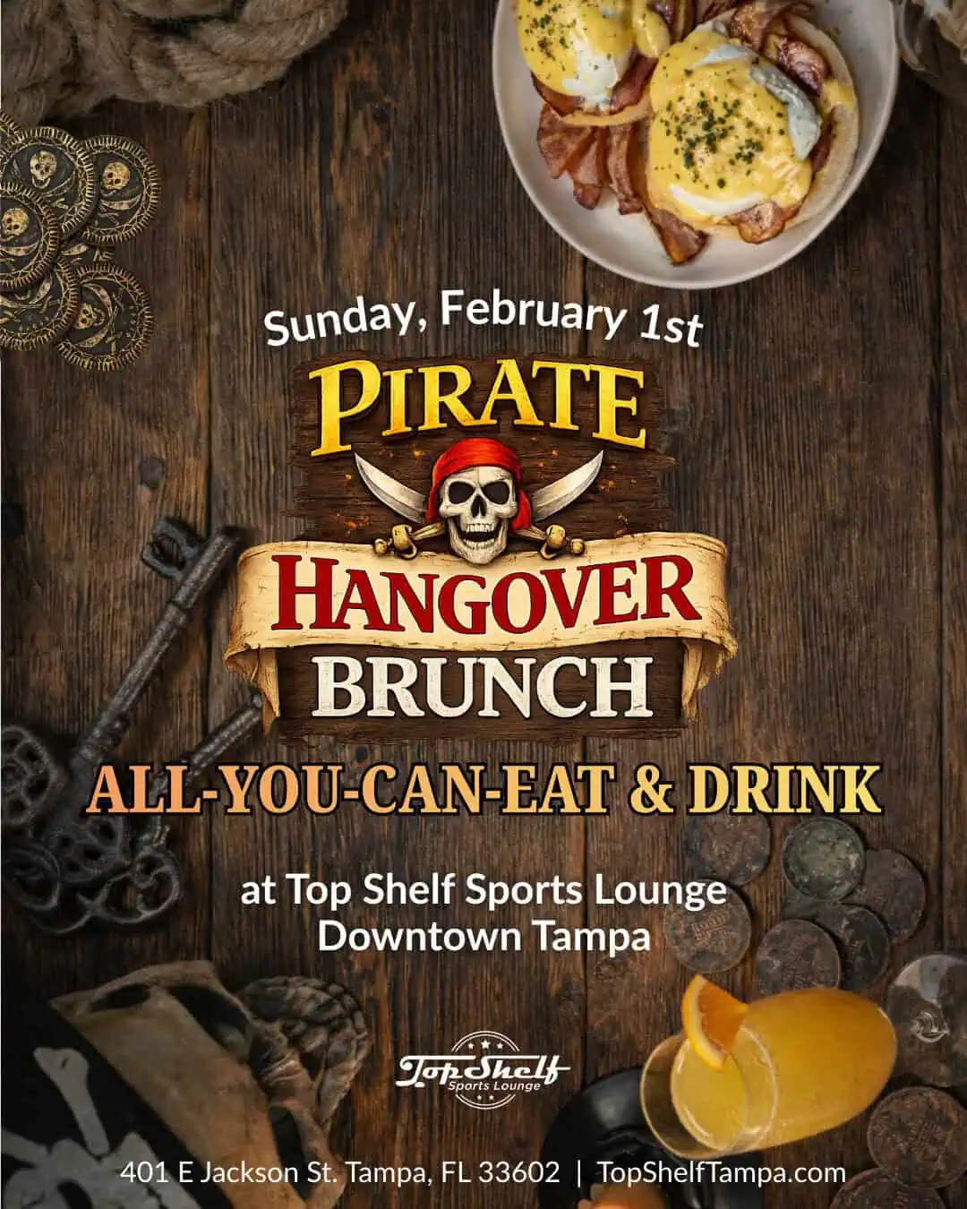Join us Sunday, February 1st, for the ultimate Pirate Hangover Brunch, happening 11am–3pm, the morning after Tampa’s biggest pirate invasion.