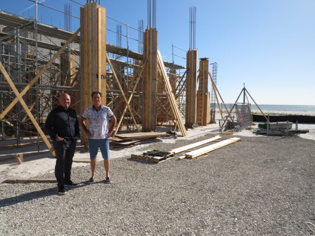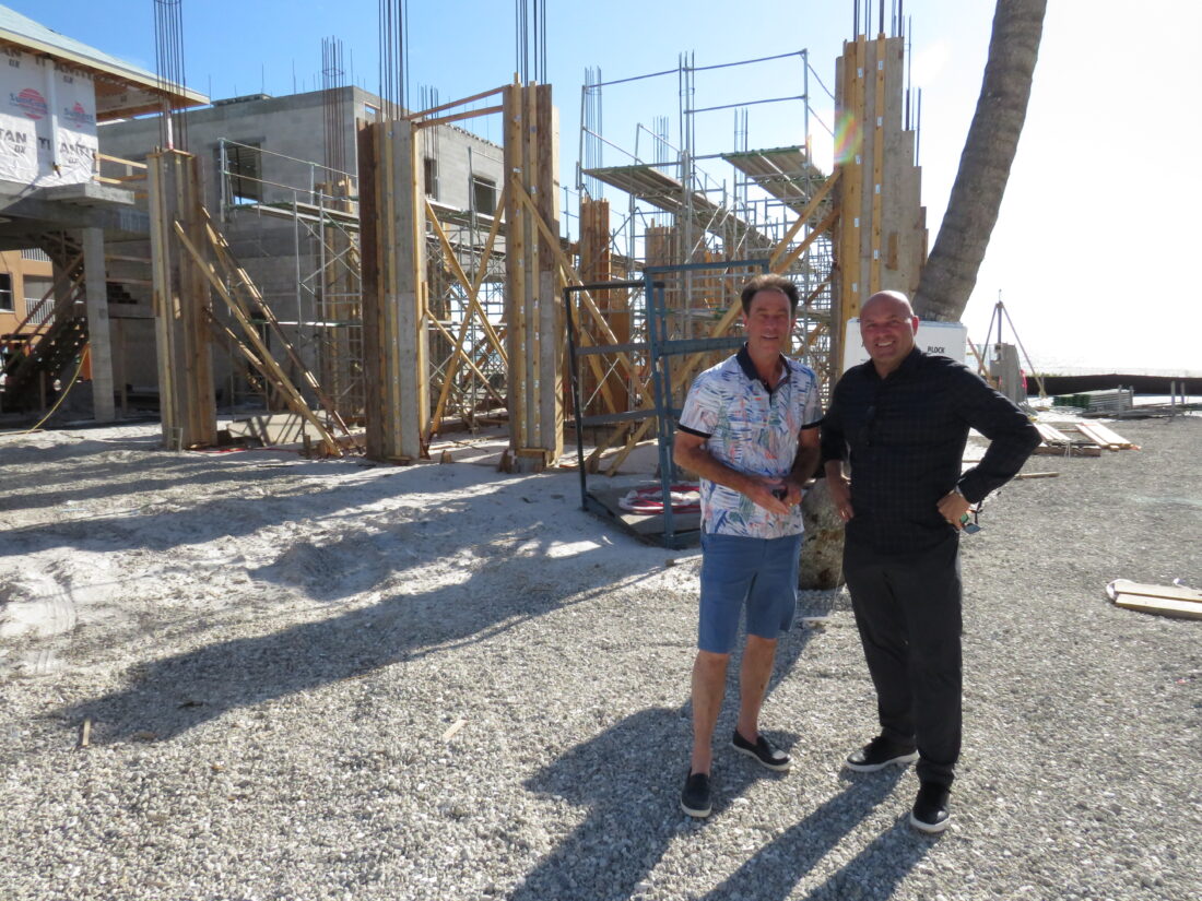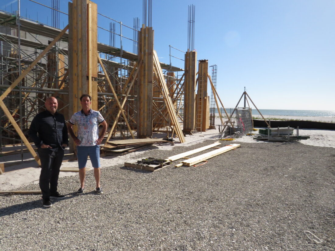 Fort Myers Beach Realtors Alex King (left) and Marc Taglieri (right) of the Alex King Group stand in front of a beachfront home under construction by Royal Corinthian Homes on the Gulf side of Fort Myers Beach. Photo by Nathan Mayberg