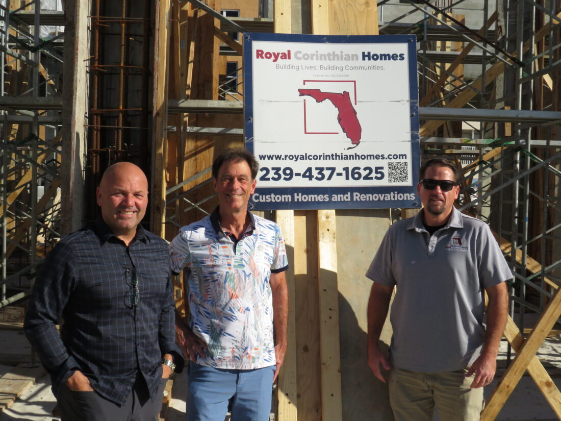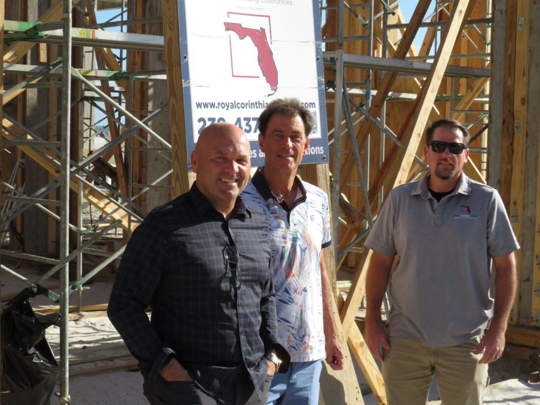 Realtor Marc Taglieri (left), Realtor Alex King (center) and Royal Corinthian Homes project manager David Hendrix (right) stand in front of what will be an all-concrete beachfront home on Fort Myers Beach. The house is expected to be ready for occupancy in early 2027.