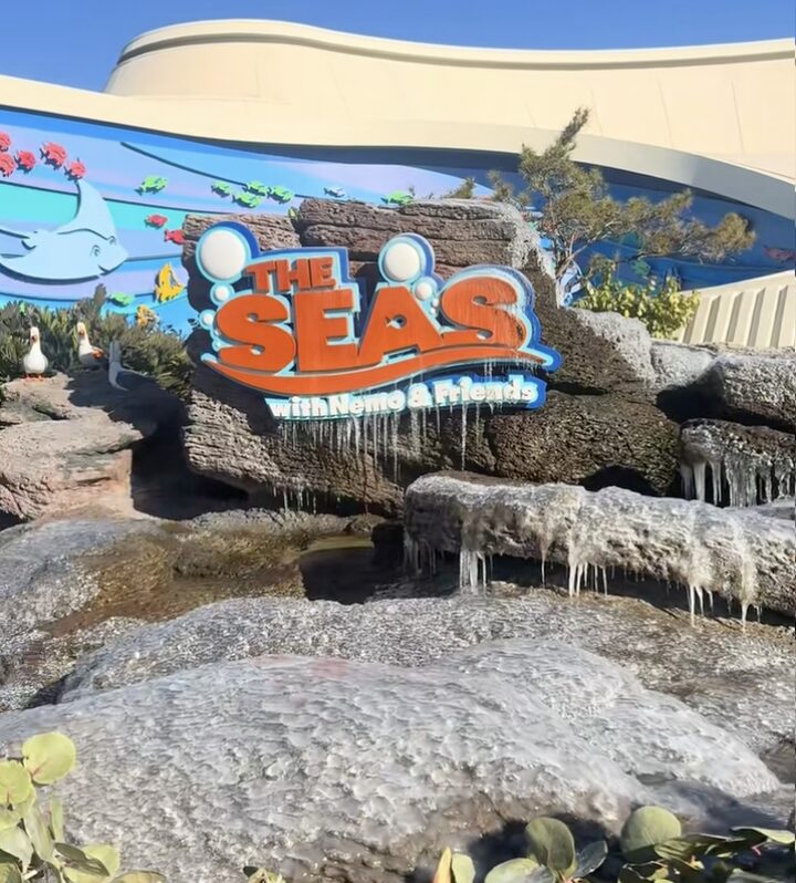 Walt Disney World guests shared images across social media of frozen fountains and misters. TikTok user @miss.bz posted a video of icicles on the sign and surrounding rockwork for The Seas With Nemo & Friends in EPCOT.