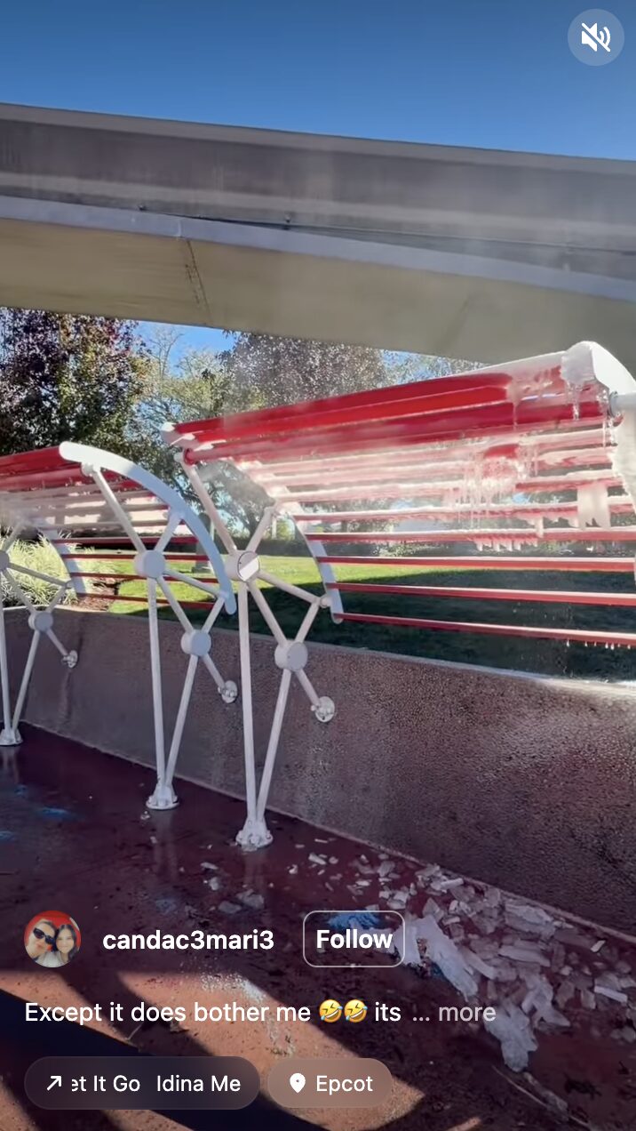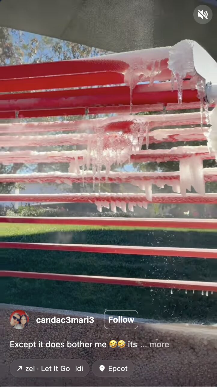 There were many cold moments to document in EPCOT. Instagram user @candac3mari3 shared video of the misters in World Discovery covered in ice. Chunks of ice had even broken off and fallen to the ground.