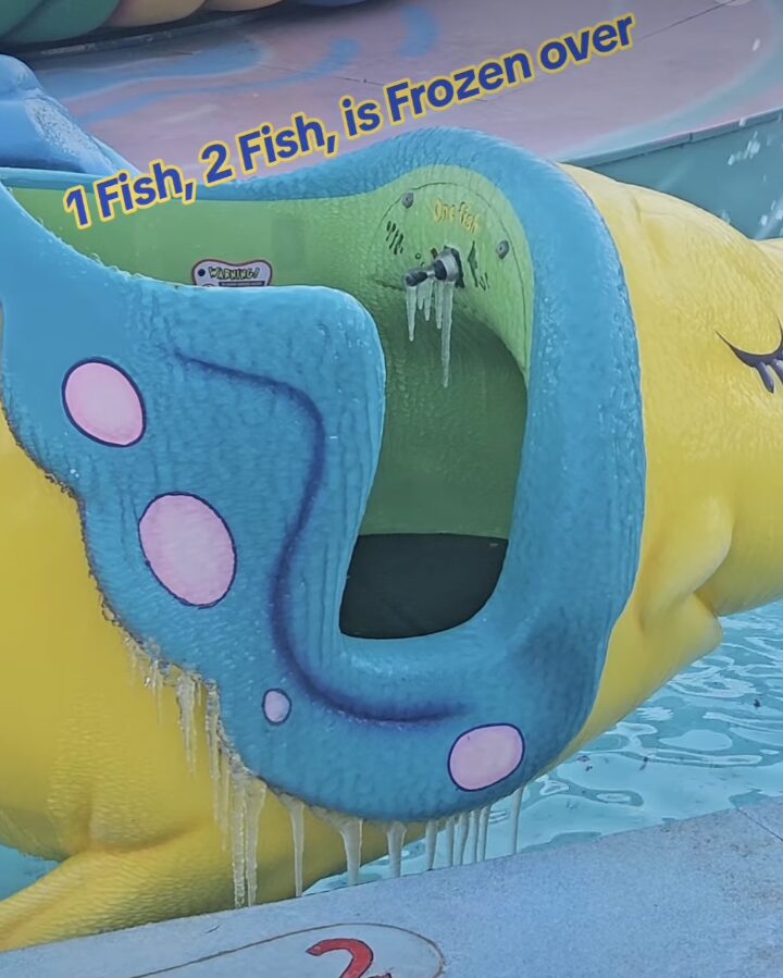 Over at Universal Islands of Adventure, Seuss Landing ride One Fish, Two Fish, Red Fish, Blue Fish had icicles dripping from its fish ride vehicles, according to a video from Instagram user @senseipawz.