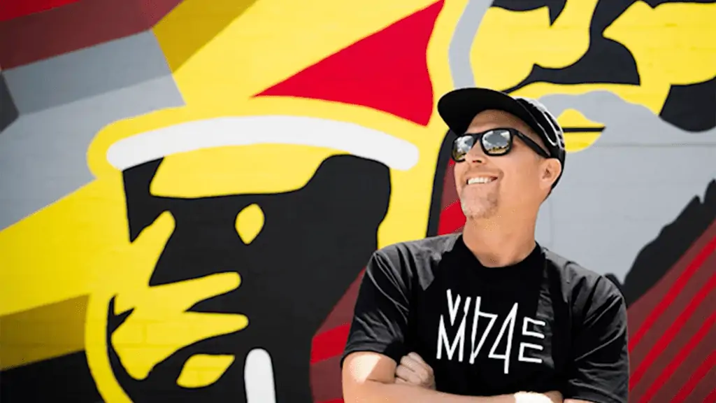 Left: A new Gillie and Marc installation in Boston, photo via Gillie and Marc. Right: Chad Mize in front of one of his murals in St. Pete, photo by I Love the Burg.