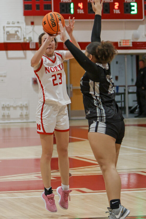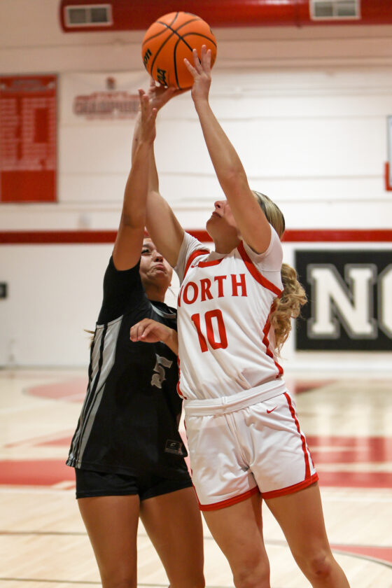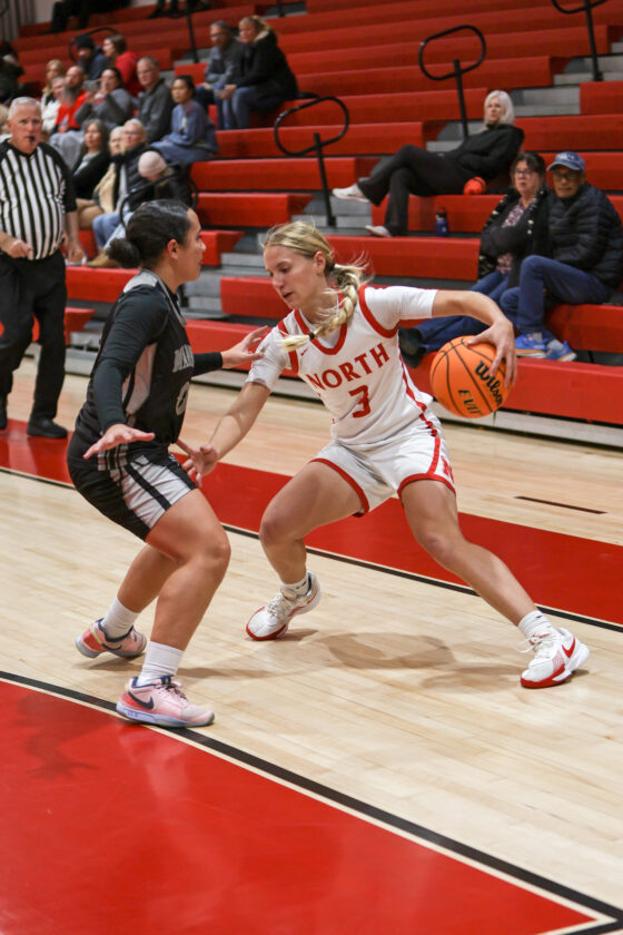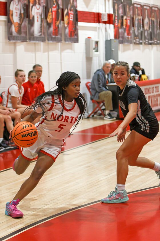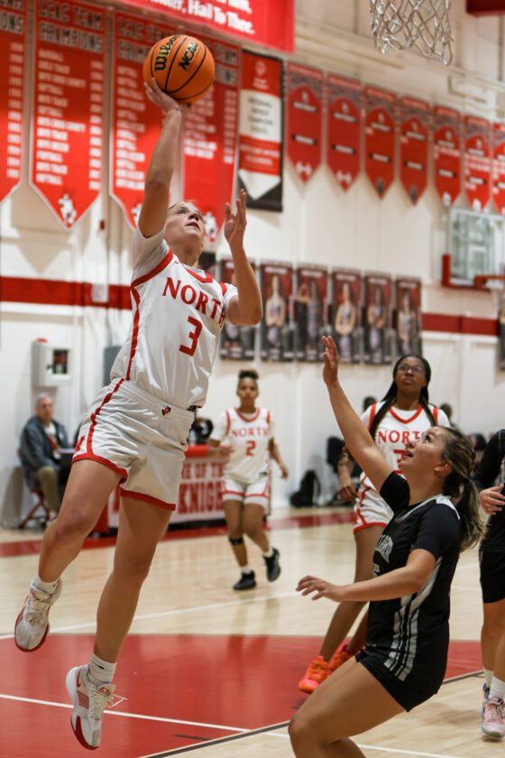 First-round action in the girls’ District 5A-11 tournament between North Fort Myers and Mariner. The Red Knights won the game 57-28. All photos by MARK CLIFFORD
