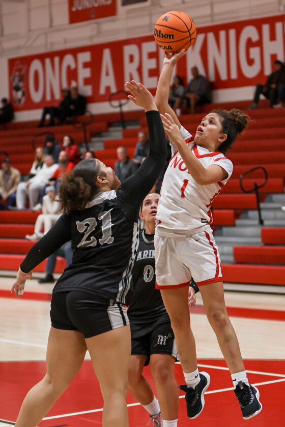 Red Knight guard Faith MacKay shoots a floating “one-handed” jump shot over Mariner defender Candice Cooper (21) while her teammate Gabriella Silva (0) watches in the background. MARK CLIFFORD