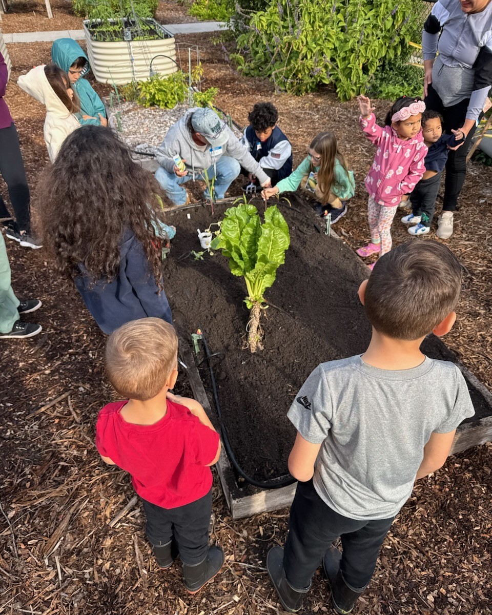 Urban agriculture specialist Teresa Hall, the Apollo Beach Garden Club marketing and events director, teaches the club’s Junior Gardeners Academy students how to plant corn seedlings they grew at home in one of the Community Garden’s beds. The plant in the foreground is perpetual spinach.