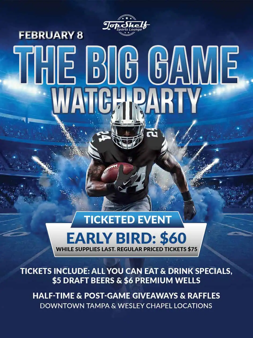 Whether you’re here for the football, the food, the drinks, or all of the above—this is the Super Bowl experience you don’t want to miss. Tickets are limited and will sell out, so lock in your spot early and make Top Shelf your home for the biggest game of the year.
