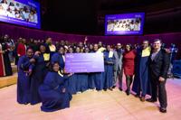 The winners of the 2025 Arsht Gospel Choir Invitational, Gamaliel Fleurantin & Community Sounds, with Arsht President and CEO Johann Zietsman, right.