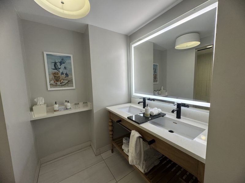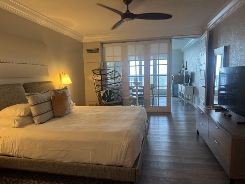Staying in a two-room ocean front suite, the foyer led to a large bedroom with a king-size bed, 60-inch flatscreen TV, large peacock-style chair, all in a neutral color palette.