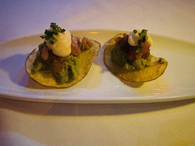An amuse bouche of homemade potato chips topped with Ahi and mashed avocado was followed by a divine marrow served in bone. Mouth-watering zucchini blossoms with creamy goat cheese was kept company by fresh ahi over sticky rice.
